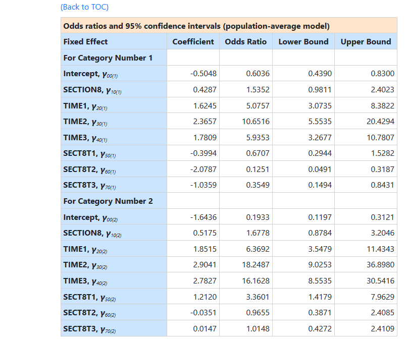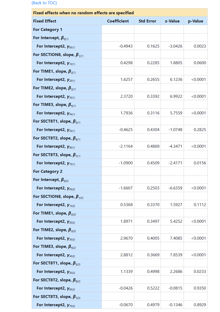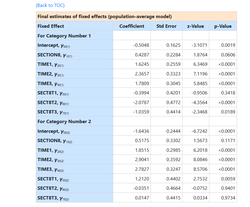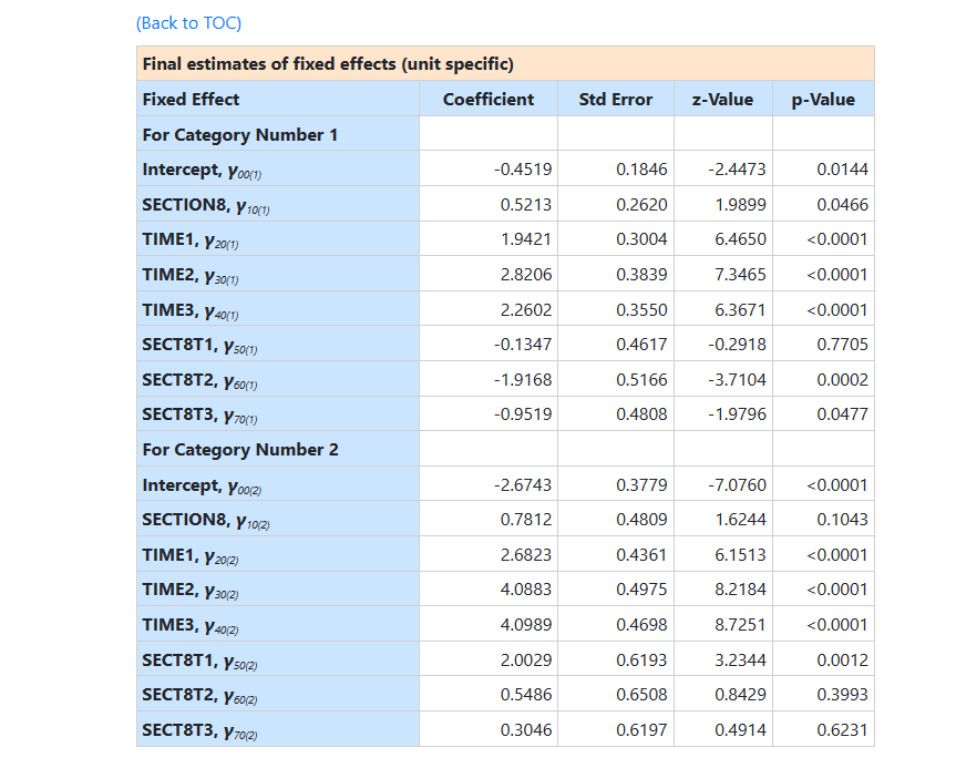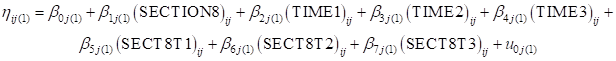 given next. The first eight values are those for the intercept, SECTION8, TIME1,