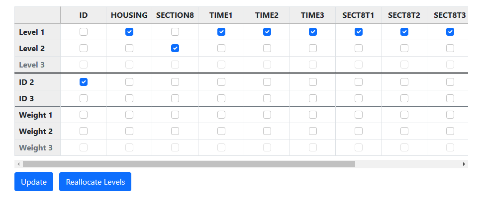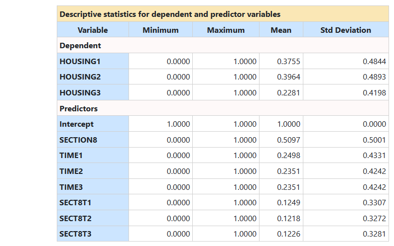 Note that the order of the indicator variables for HOUSING is the opposite of the original coding of the variable: as we selected the