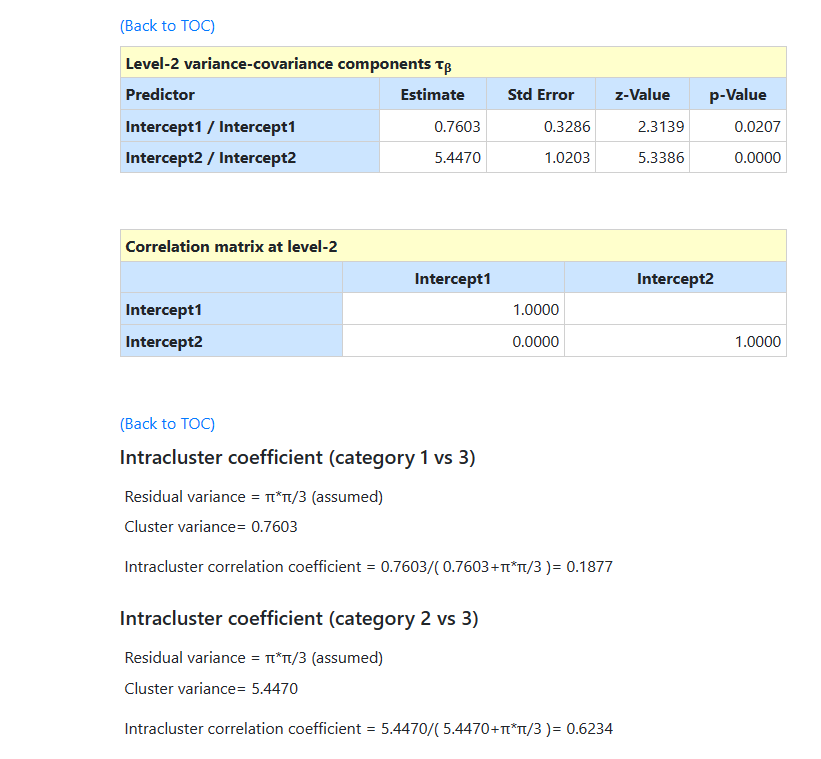 The output also includes the intracluster correlation coefficient for both categories, and population average results, as shown