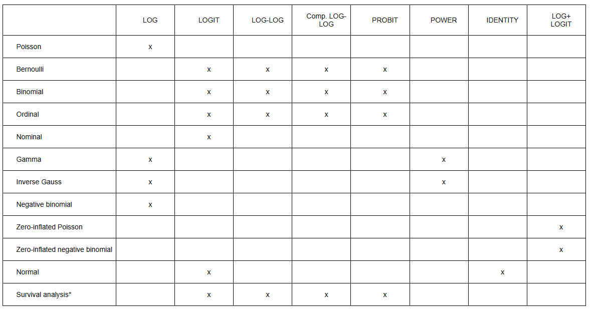 logistic, complimentary log-log, log-log, probit, power, and identity. Here is