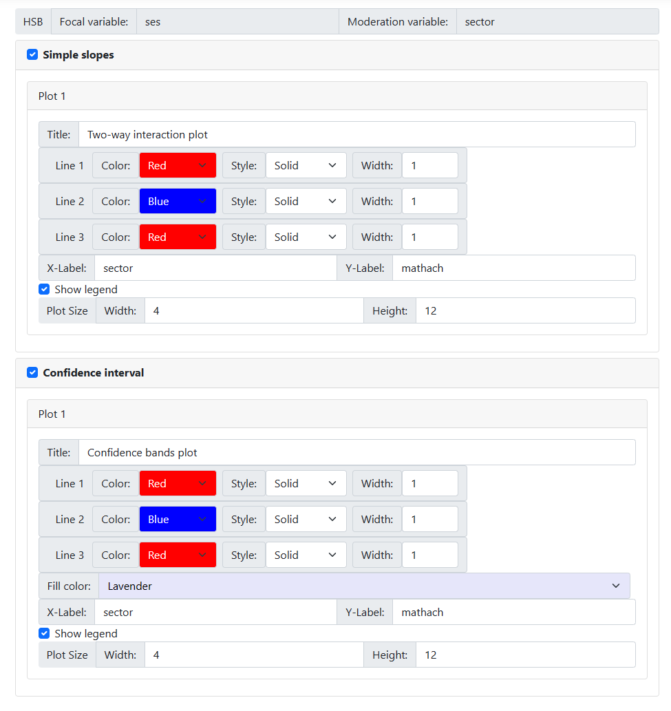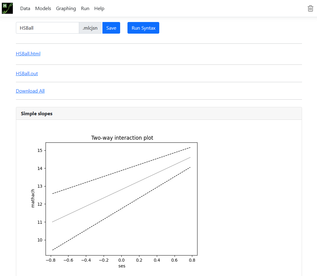 Results of the analysis are available from the Run page via links. Both HTML and standard txt file output are available. Moderation graphs, if requested, are also given here. In addition, all relevant files, from data to syntax to output, can be downloaded by clicking on the Download All link.
