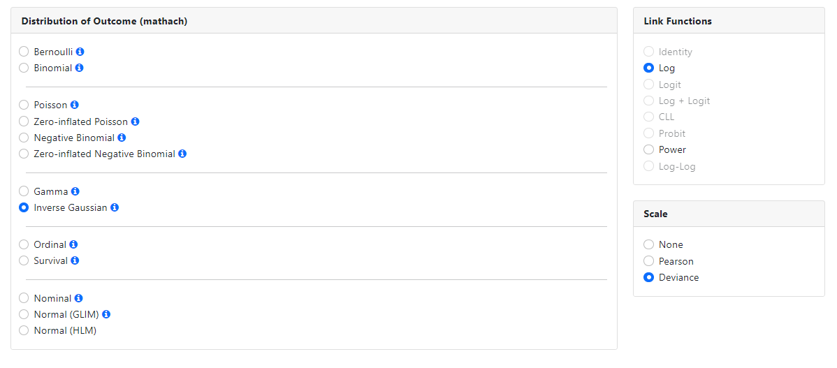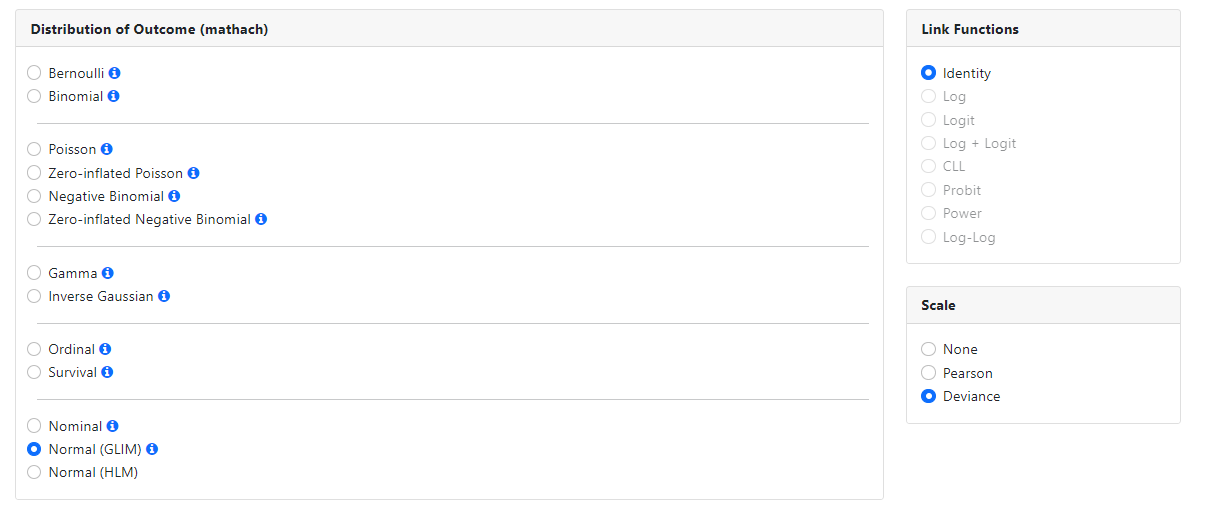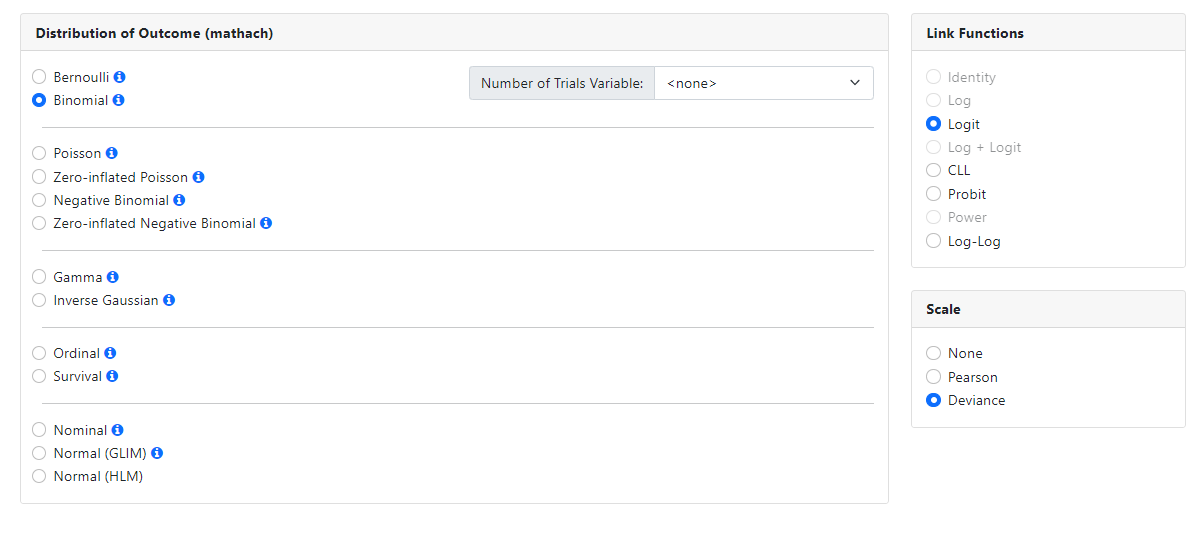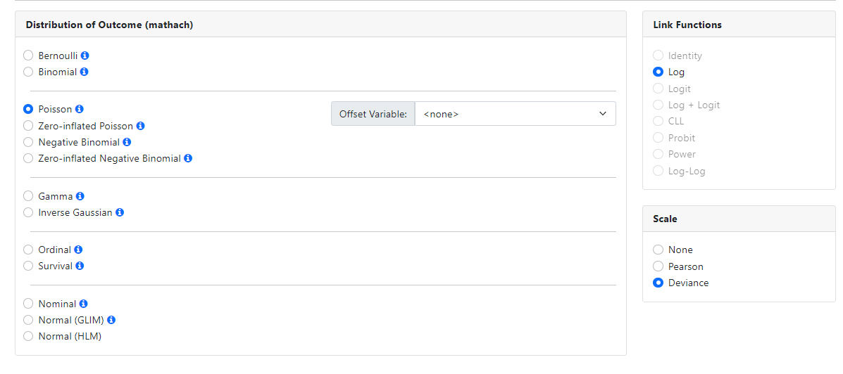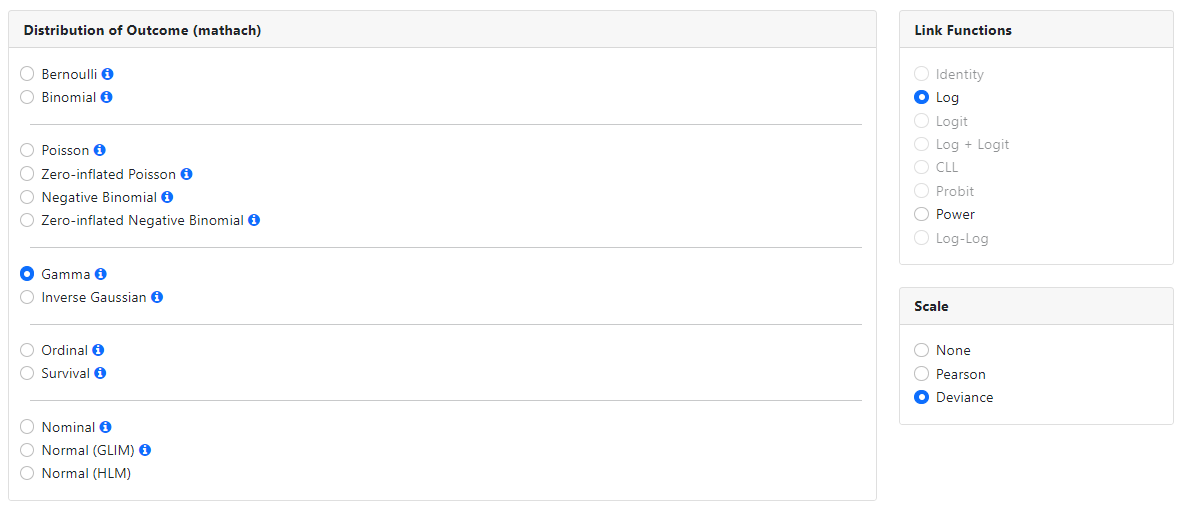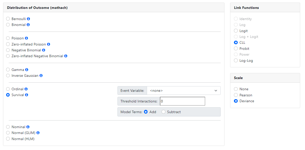 of the outcome variable. Link functions, as appropriate, are also selected here.