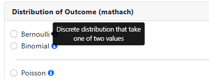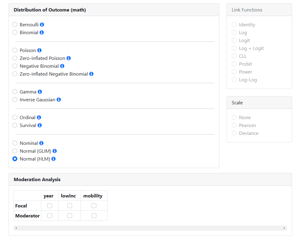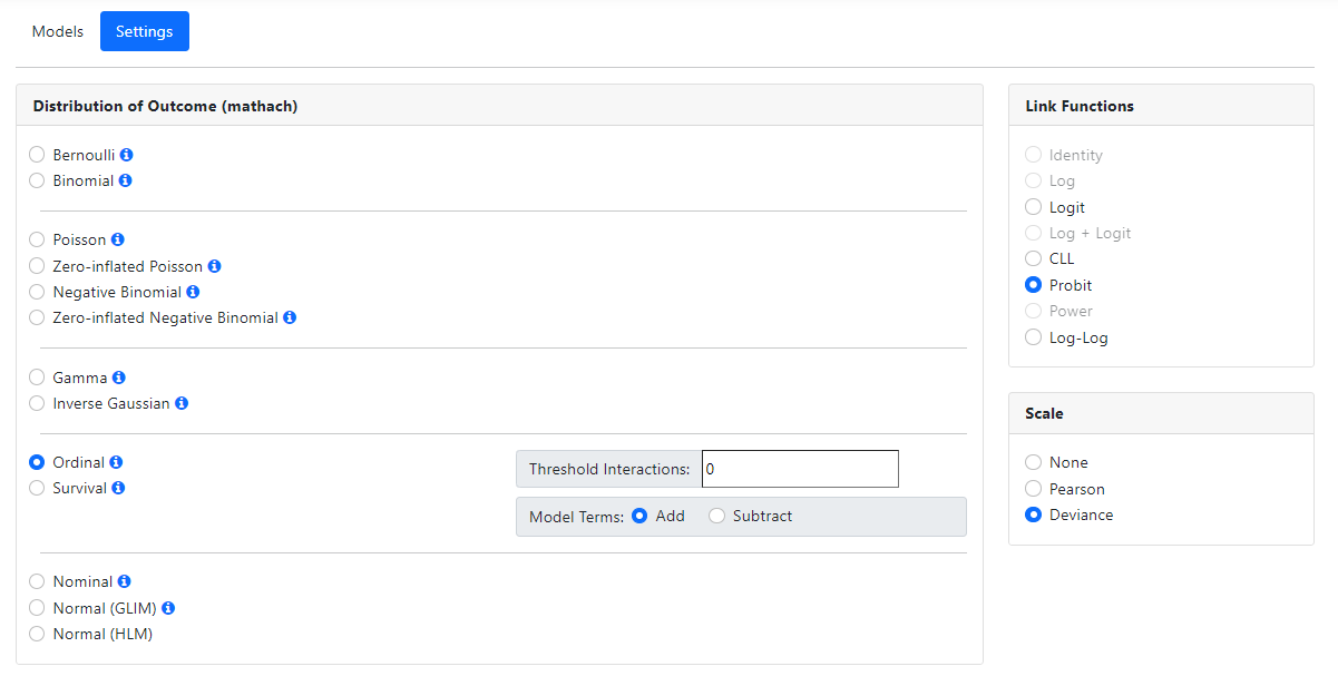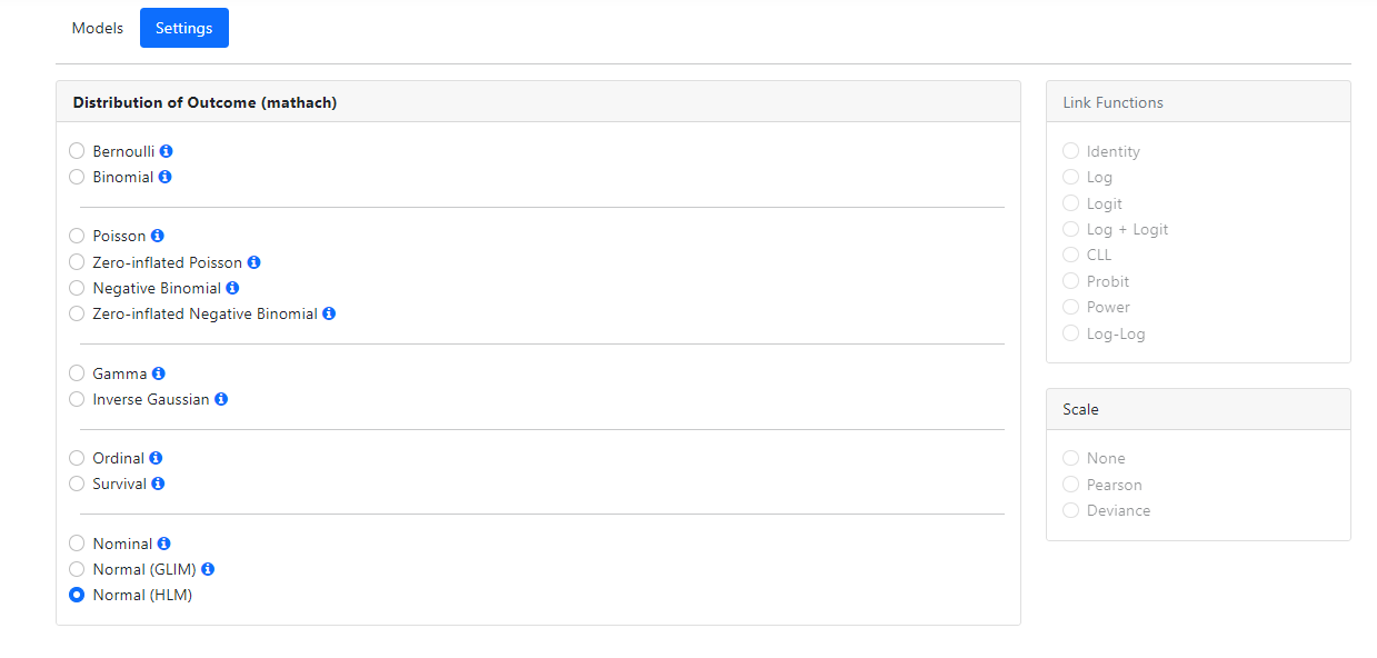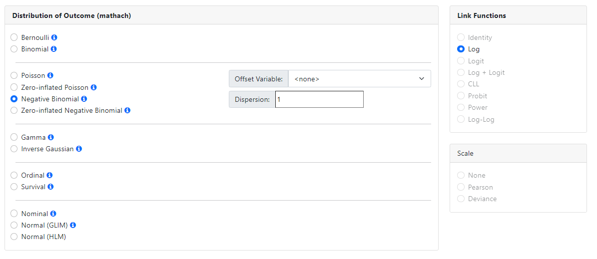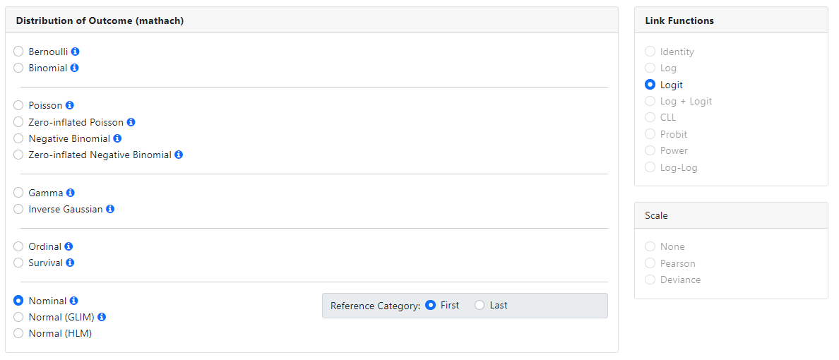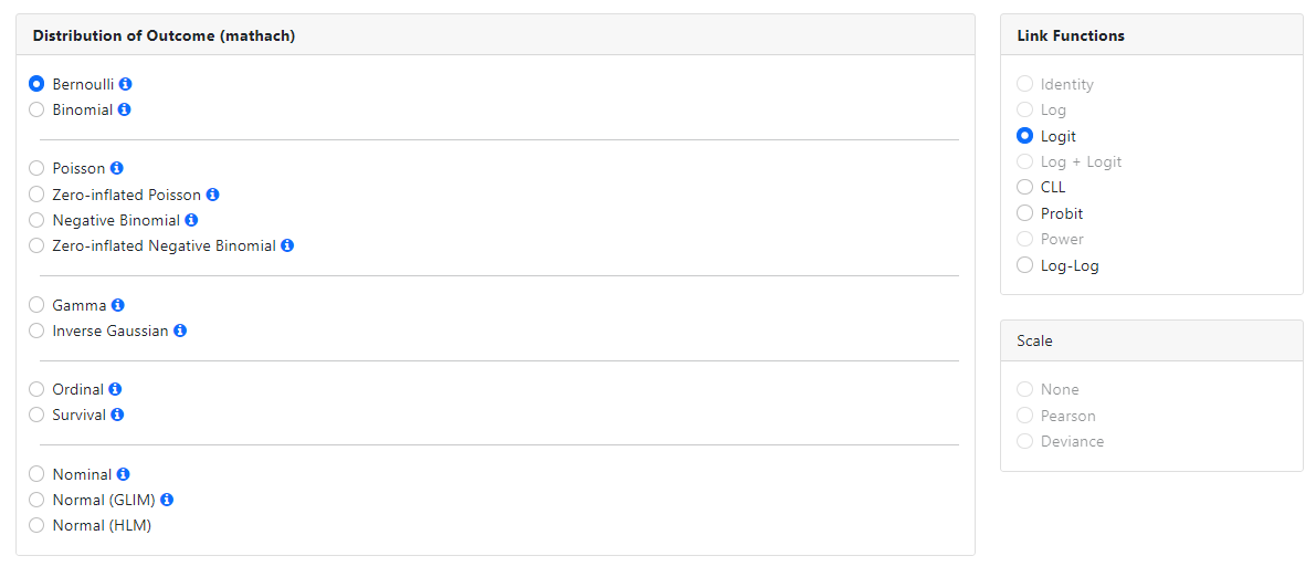 of the outcome variable. Link functions, as appropriate, are also selected here.