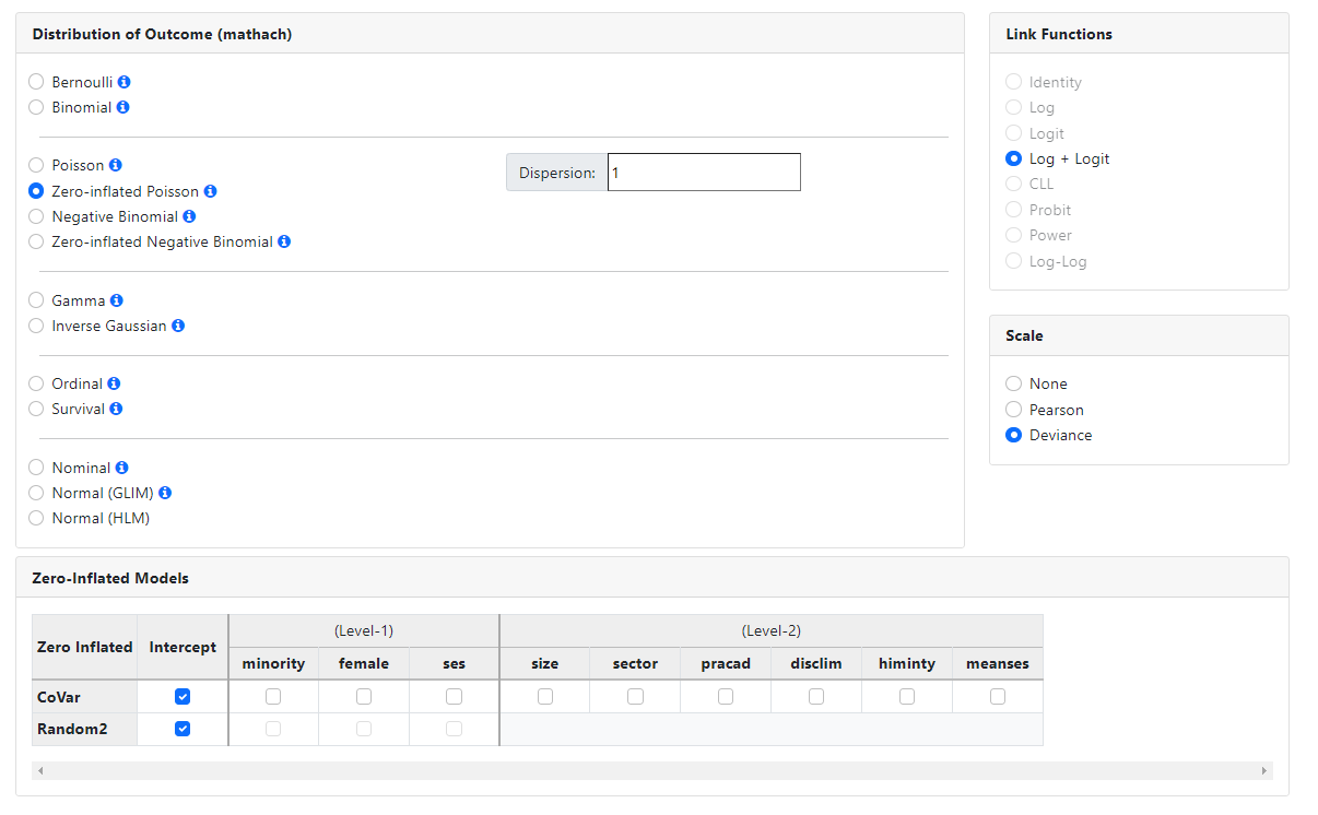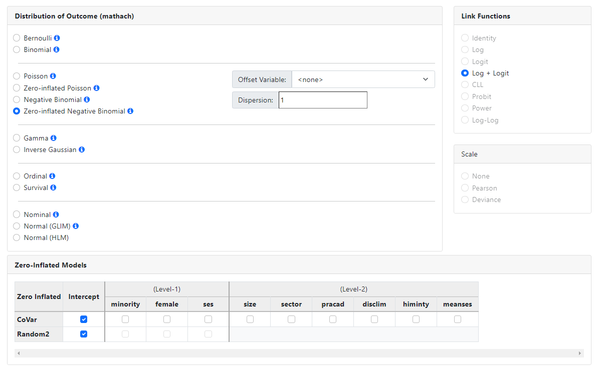 For the zero-inflated models, the Zero-Inflated Models field is activated. This