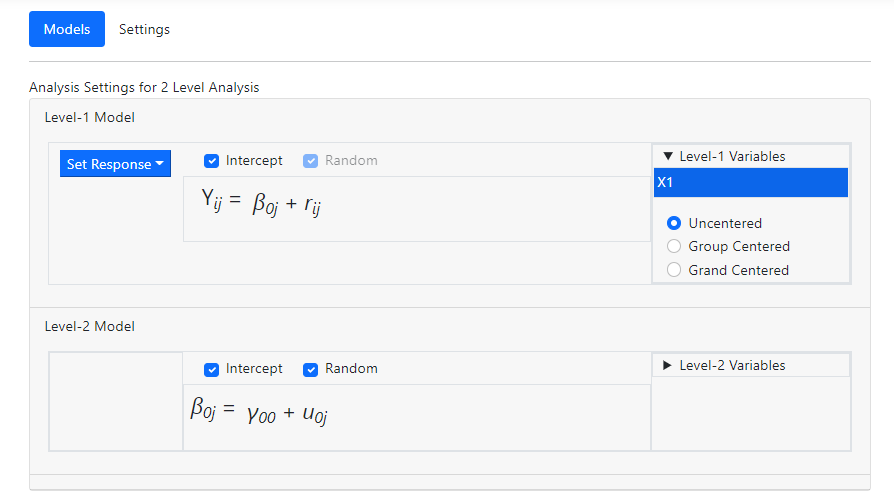 label X1 and drag it into the level-1 equation as uncentered predictor before